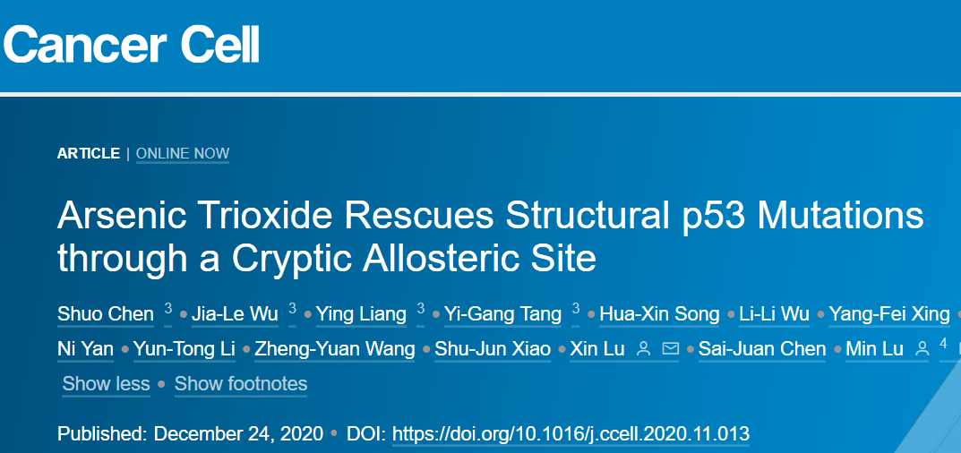 2020年12月24日,基因解码科学家实现了突破,在 Cancer Cell杂志上发表了文章 Arsenic Trioxide Rescues Structural p53 Mutations through a Cryptic Allosteric Site,提出了针对抑癌蛋白设计和寻找靶向药物的理论,并根据此理论,观察并解释老化合物三氧化二砷(ATO)可以恢复部分基因突变导致的P53蛋白缺陷,在国际上提出了根据抑癌蛋白肿瘤基因设计和选择靶向药物的方法和案例。