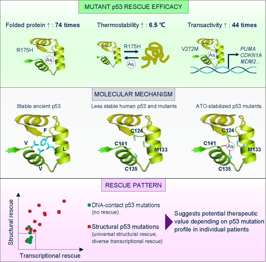 然而,总体而言,ATO在非APL白血病上的临床缓解率低。发现APL特有的PML-RAR以外的ATO作用靶点,正确选择可能取得疗效的病人,是实现ATO“老药新用”的重要环节。近期,上海交通大学医学院附属瑞金医院 卢敏研究员等发表在 Cancer Cell 上的工作揭示ATO可直接靶向结构突变型p53,促使这一类蛋白更容易折叠并恢复其抑癌功能。该研究显示, 相比于已经报道的p53靶向化合物低下或者难以检测的p53复活效率,ATO在复活p53效率上具有一到多个数量级上的优势,并具明确的p53突变适用谱,即诱导p53不折叠的那一类“结构型突变”。
